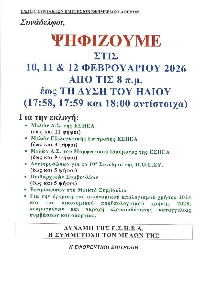 ENΩΣΙΣ ΣΥΝΤΑΚΤΩΝ ΗΜΕΡΗΣΙΩΝ ΕΦΗΜΕΡΙΔΩΝ ΑΘΗΝΩΝ _______________________________ ΕΦΟΡΕΥΤΙΚΗ ΕΠΙΤΡΟΠΗ Αθήνα, 4 Φεβρουαρίου 2026 Α Ν Α Κ Ο Ι Ν Ω Σ Η ΘΕΜΑ: Διαδικασία για τις εκλογές της 10ης – 11ης & 12ης Φεβρουαρίου ...