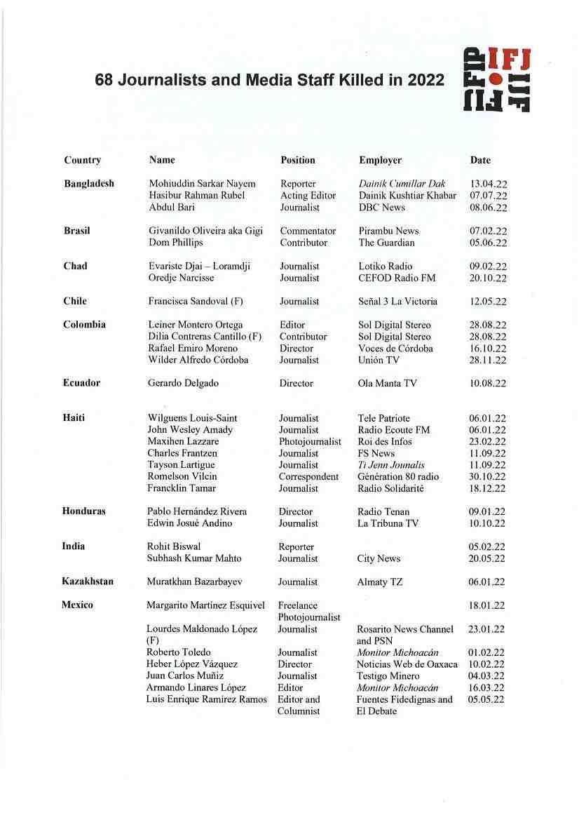 Η ΔΟΔ έχει καταγράψει 68 δολοφονίες δημοσιογράφων και εργαζόμενων ΜΜΕ κατά τη διάρκεια του 2022, έναντι 47 το 2021 και τα τελευταία χρόνια καταγραφόταν πτώση του αριθμού των δολοφονιών. Υπήρξαν, επίσης, 11 θάνατοι που σχετίζονταν με ατυχήματα και ασθένειες, συμπεριλαμβανομένων τριών δημοσιογράφων και εργαζομένων ΜΜΕ που απεβίωσαν ενώ έκαναν ρεπορτάζ για το Παγκόσμιο Κύπελλο 2022 στο Κατάρ.