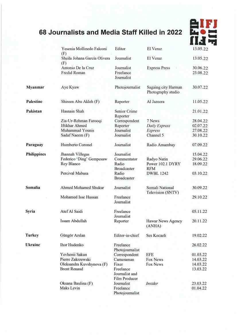 Ακολουθεί η λίστα της ΔΟΔ με τους δημοσιογράφους που δολοφονήθηκαν το 2022.
