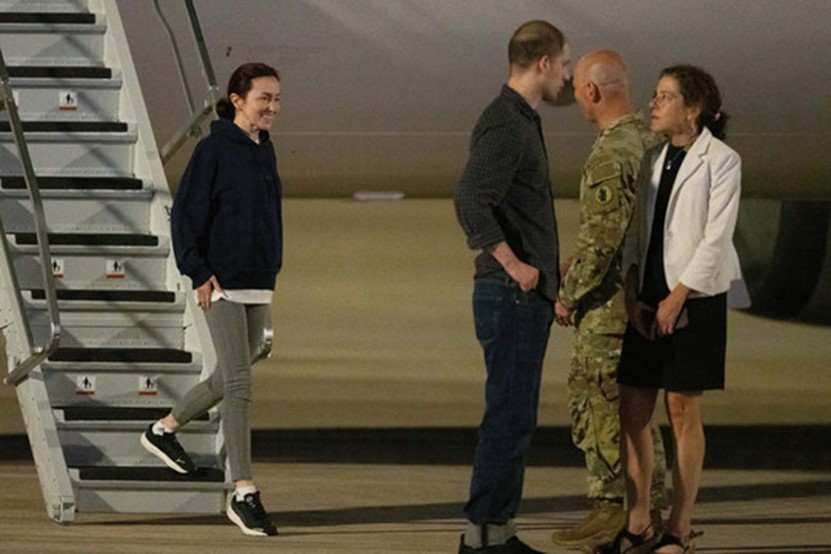 Πρώην κρατούμενοι που απελευθερώθηκαν από τη Ρωσία, ο Αμερικανός δημοσιογράφος Evan Gershkovich και η Αμερικανο-Ρωσίδα δημοσιογράφος Alsu Kurmasheva περπατούν στην άσφαλτο μετά την προσγείωση στην Κοινή Βάση San Antonio-Kelly Field, Τέξας, στις 2 Αυγούστου 2024. Πηγή: Suzanne Cordeiro / AFP