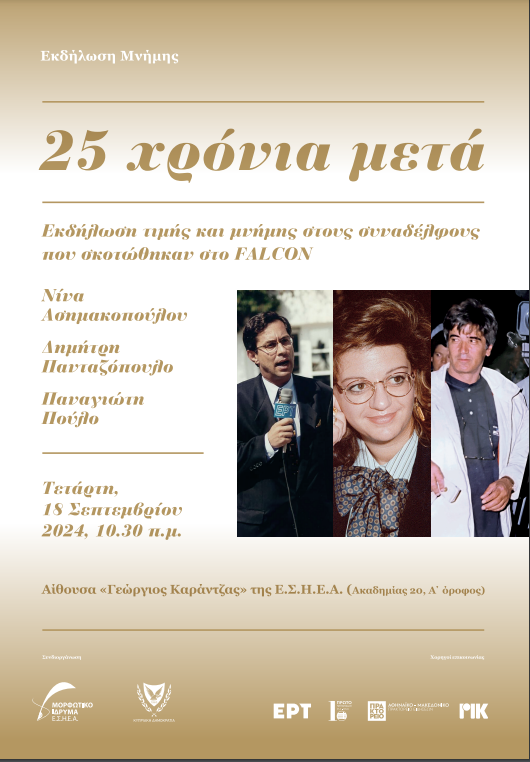 Η εκδήλωση πραγματοποιείται με αφορμή την συμπλήρωση 25 χρόνων από την πτώση του FALCON τον Σεπτέμβριο του 1999, την Τετάρτη, 18 Σεπτεμβρίου 2024, 10.30 το πρωί στην Αίθουσα «Γεώργιος Καράντζας» του Μεγάρου της Ε.Σ.Η.Ε.Α. (Ακαδημίας 20, α’ όροφος),