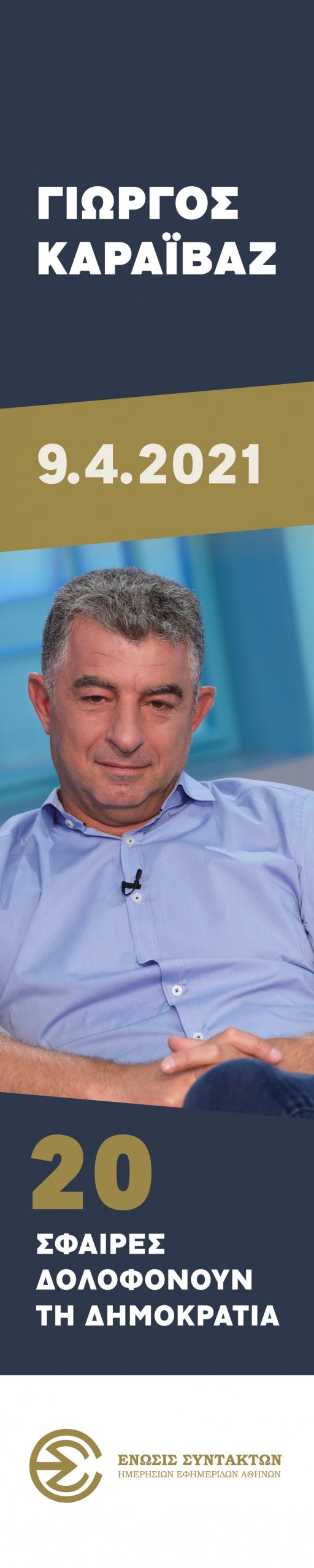 «20 ΣΦΑΙΡΕΣ ΔΟΛΟΦΟΝΟΥΝ ΤΗ ΔΗΜΟΚΡΑΤΙΑ» είναι το μήνυμα που επιγράφει το banner διαστάσεων 3m x 60cm με τη φωτογραφία του δολοφονημένου συναδέλφου Γιώργου Καραϊβάζ, το οποίο τοποθετήθηκε σήμερα στην κεντρική όψη του κτηρίου της ΕΣΗΕΑ, επί της οδού Ακαδημίας 20 και αναγράφει, επίσης, την ημερομηνία της δολοφονίας του (9.4.2021).