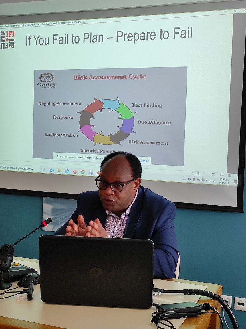 Με εισηγητή τον αρμόδιο σε θέματα ασφάλειας δημοσιογράφων, της Διεθνούς Ομοσπονδίας, Ernest Sagaga, ξεκίνησε σήμερα το σεμινάριο «Η ασφάλεια των δημοσιογράφων σε εμπόλεμες ζώνες και επικίνδυνες καταστάσεις- σεισμούς, πυρκαγιές, ακραία καιρικά φαινόμενα και διαμαρτυρίες».