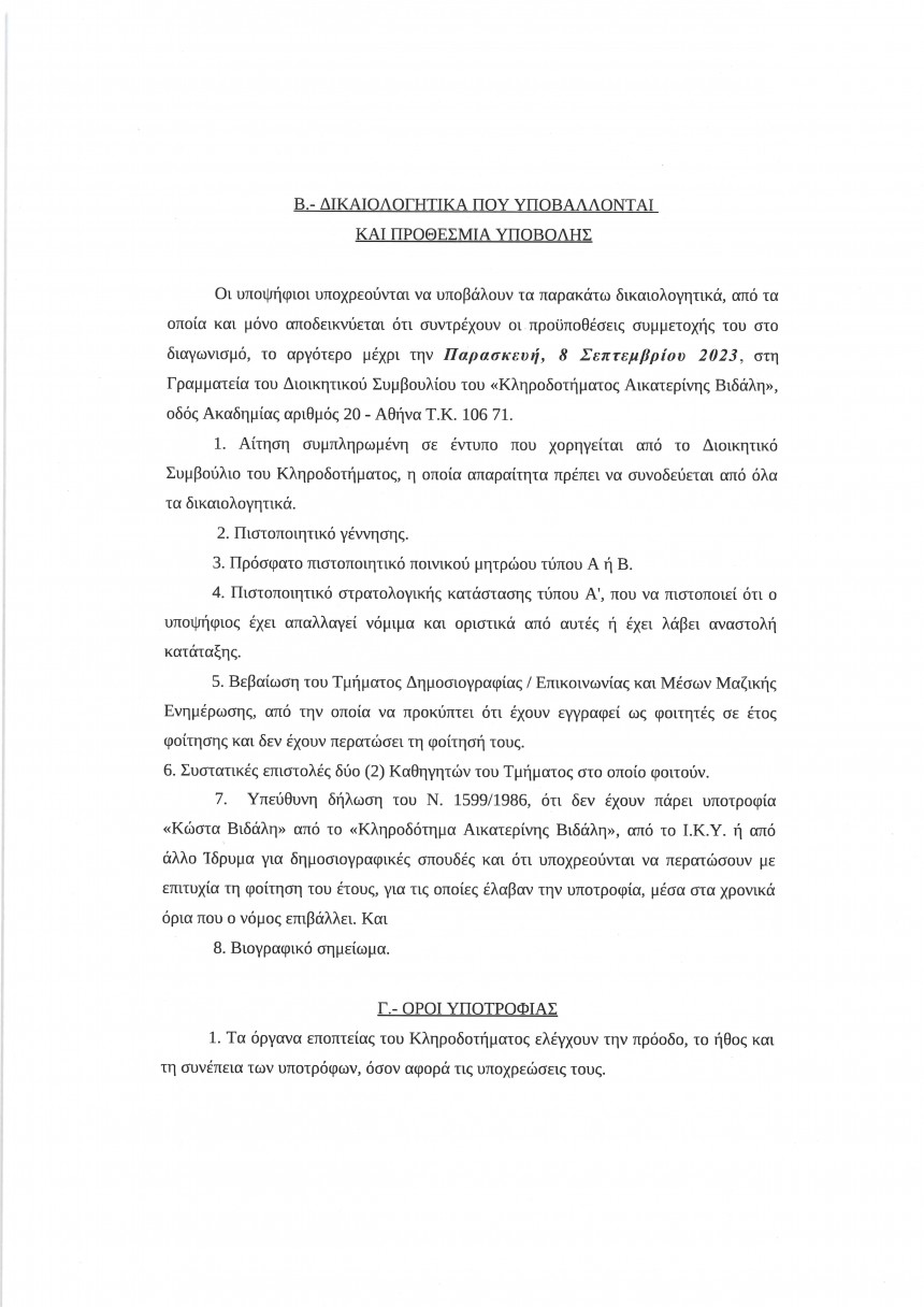 Το Διοικητικό Συμβούλιο του «Κληροδοτήματος Αικατερίνης Βιδάλη» προκηρύσσει διαγωνισμό, για την ανάδειξη ενός/μιας (1) υποτρόφου της υποτροφίας «Κώστα Βιδάλη», φοιτητή/φοιτήτριας Τμημάτων Επικοινωνίας και Μέσων Μαζικής Ενημέρωσης του Εθνικού και Καποδιστριακού Πανεπιστημίου Αθηνών, του Παντείου Πανεπιστημίου ή του Αριστοτελείου Πανεπιστημίου Θεσσαλονίκης, για το ακαδημαϊκό έτος 2022-2023.